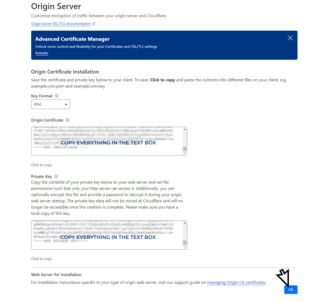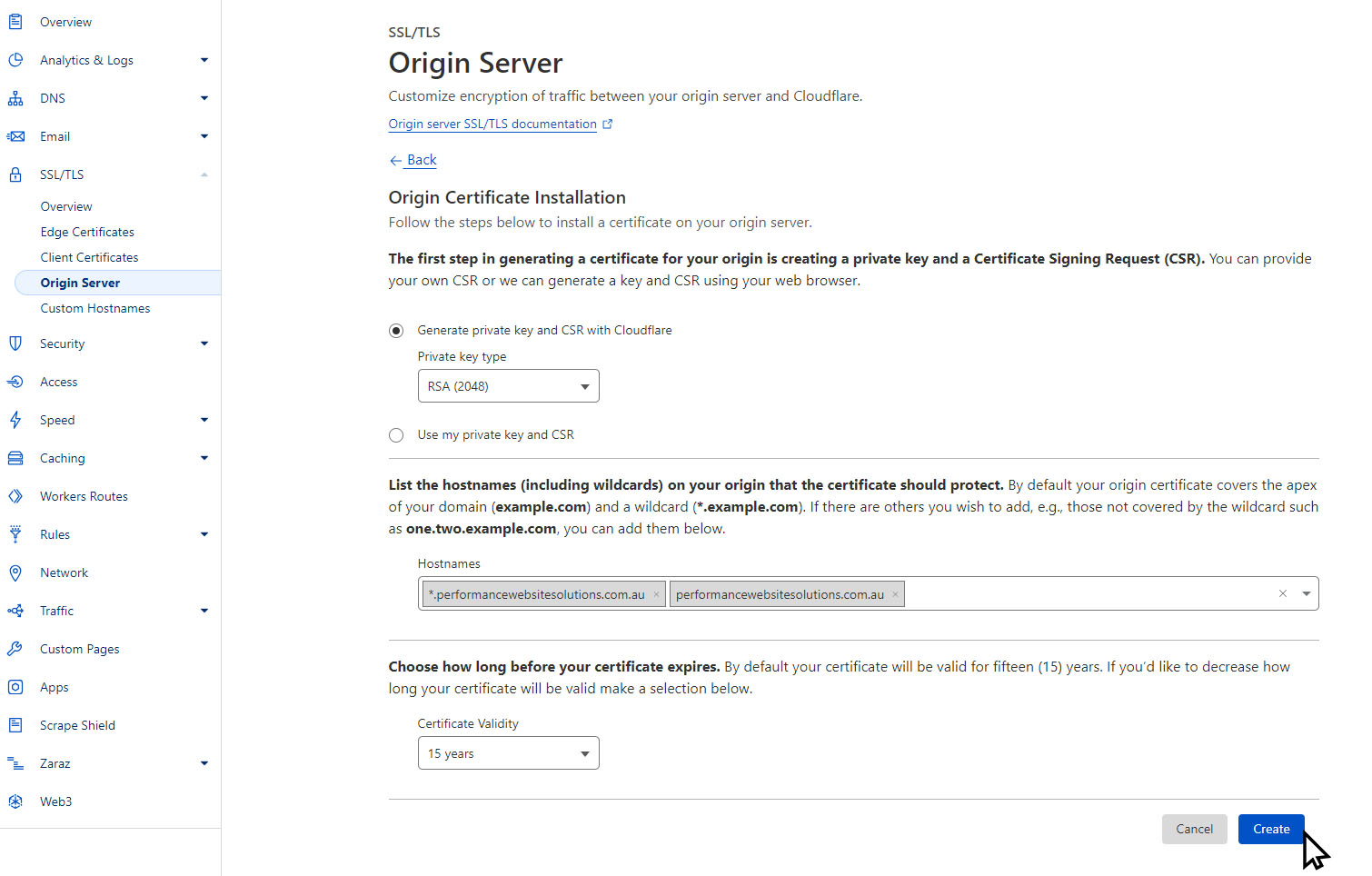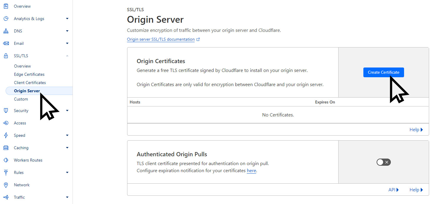 Let’s generate a CloudFlare SSL Certificate on the CloudFlare Dashboard.